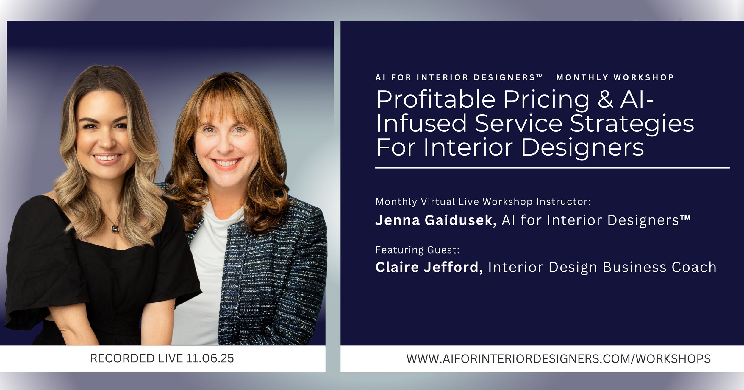 Choose 1 Workshop Ticket- “Profitable Pricing & AI-Infused Service Strategies For Interior Designers | November” This is for a 1 time workshop purchase ($149- one time registration fee).