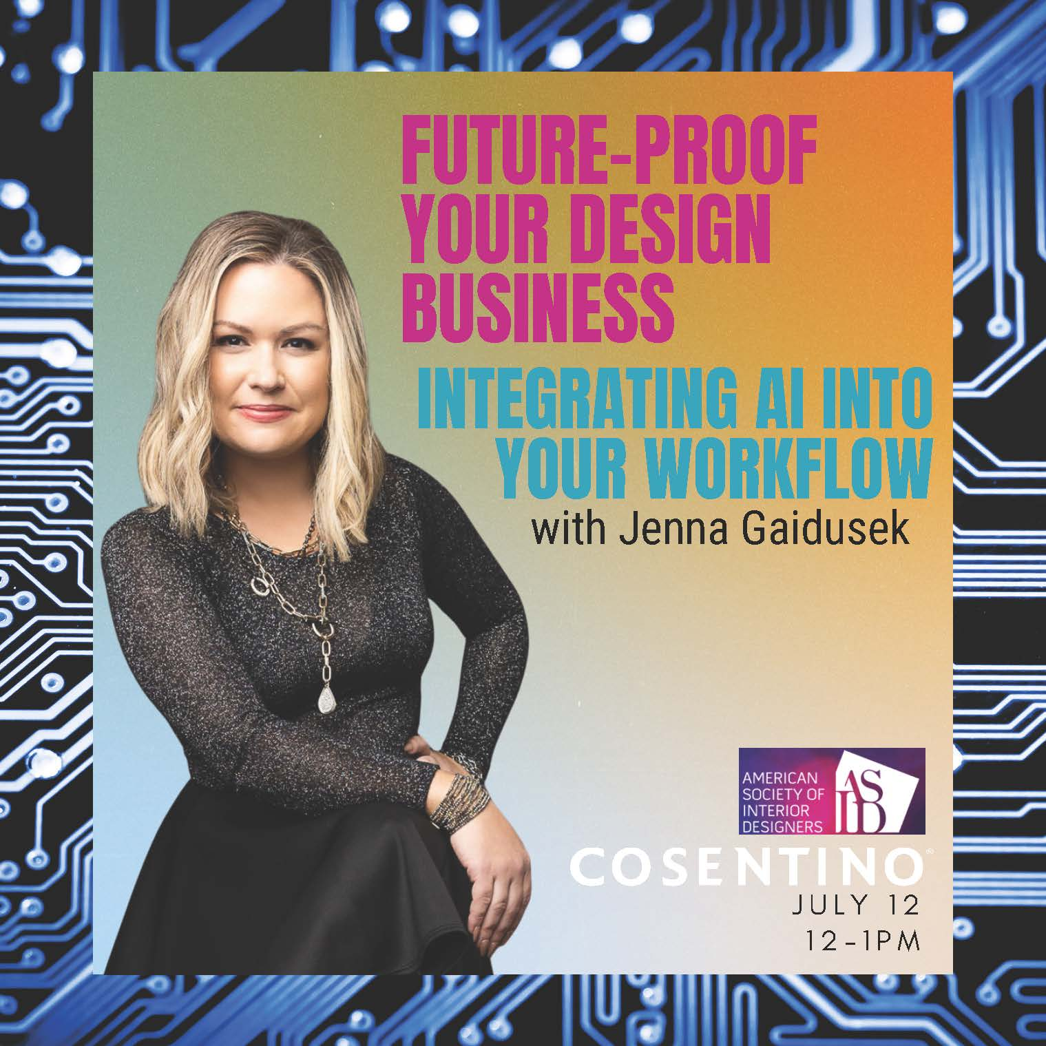 This in-person event will take place at 12:00PM PST at Cosentino in the Miramar/Mesa area. Jenna Gaidusek will share her expertise on leveraging AI to enhance your design business.